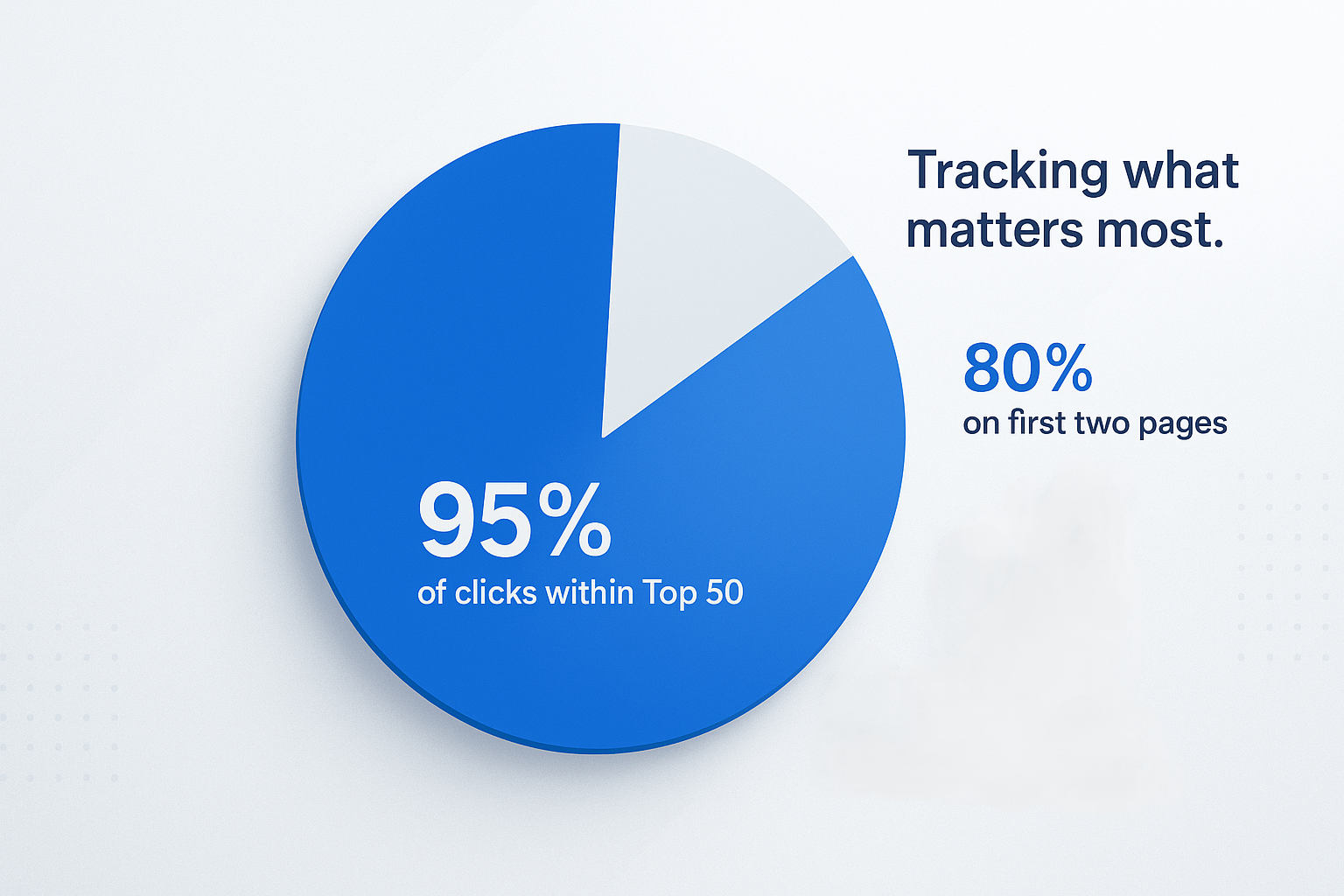 Nearly 95 percent of clicks happen within the first 50 results, and more than 80 percent occur on the first two pages. The reality is that rankings beyond position 50 rarely generate measurable traffic.